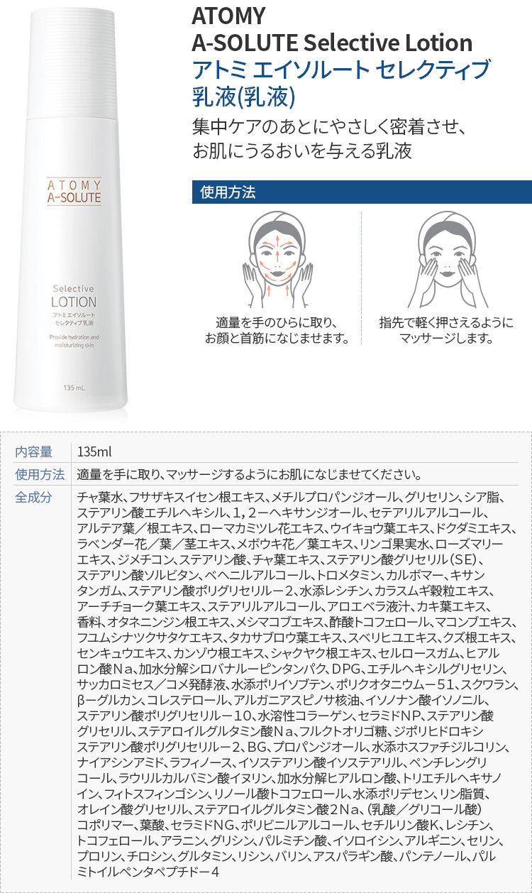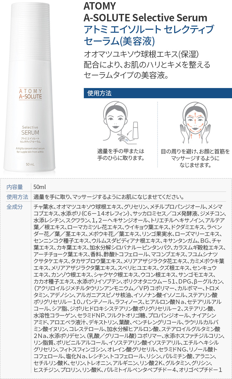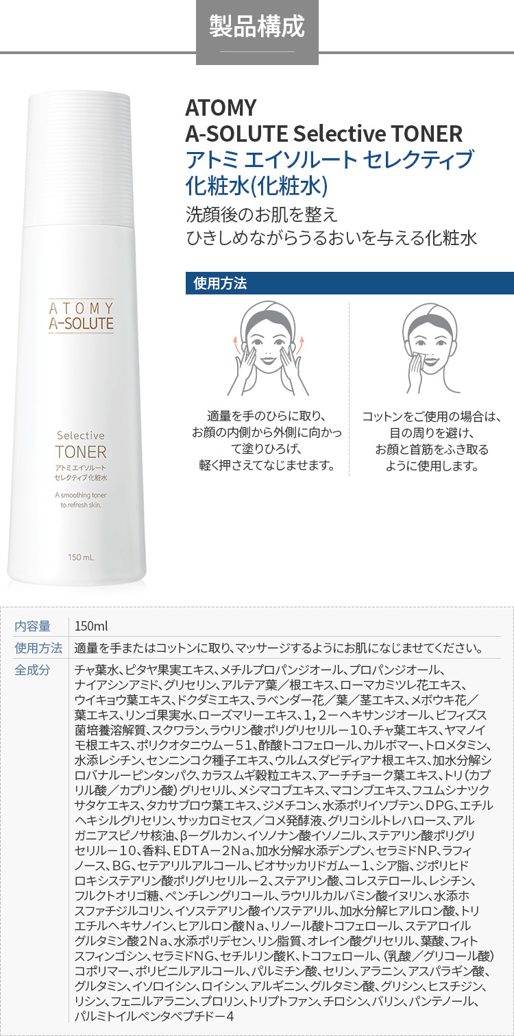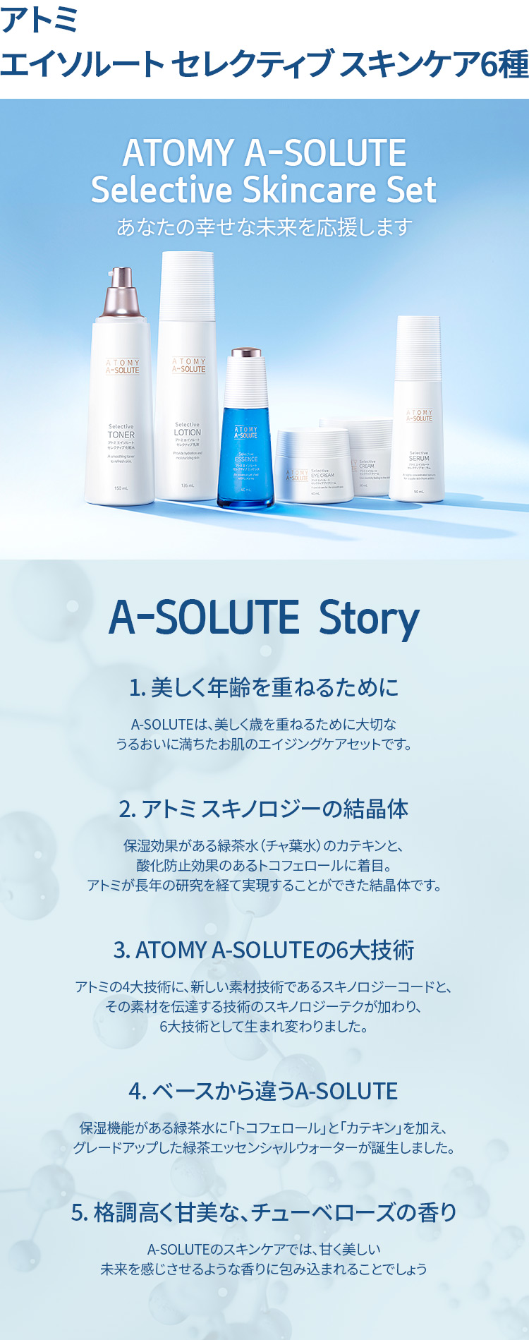 ・エイソルートセレクティブ 化粧水 150ml ・エイソルートセレクティブ エッセンス(美容液) 40ml ・エイソルートセレクティブ セーラム(美容液) 50ml ・エイソルートセレクティブ 乳液 135ml ・エイソルートセレクティブ アイクリーム 40ml |