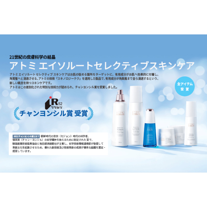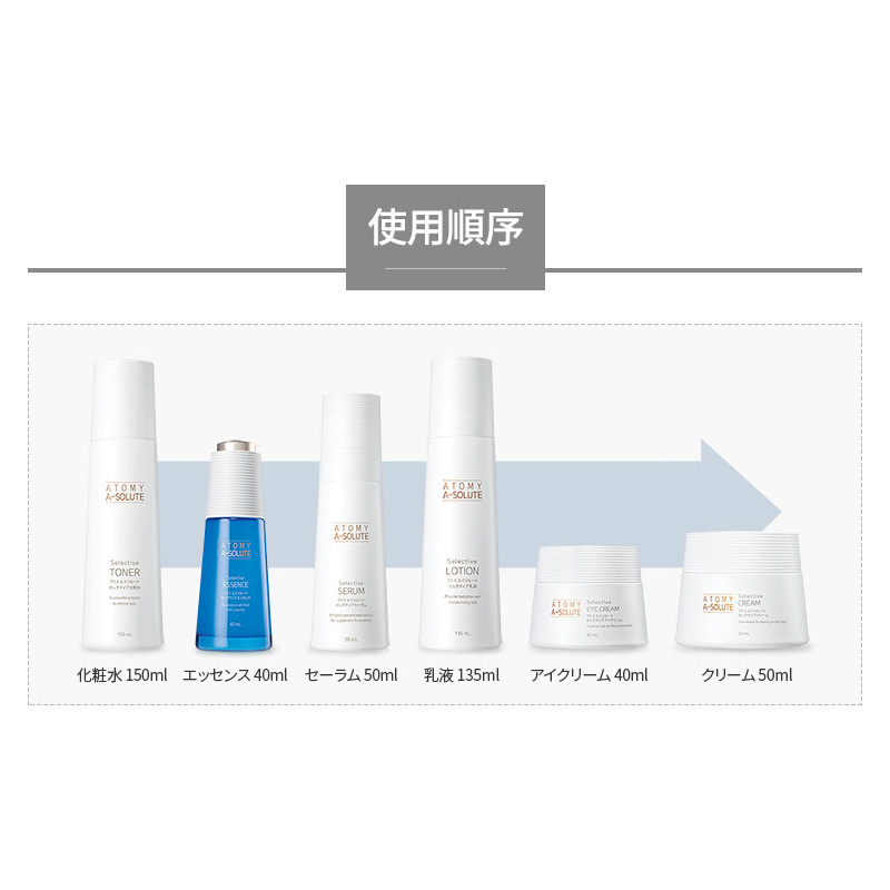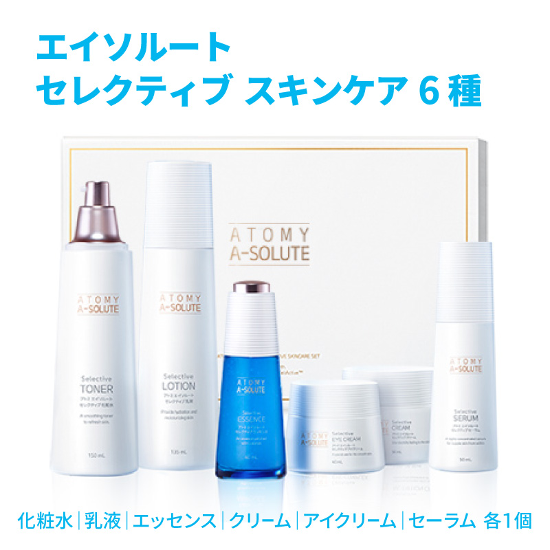 ・エイソルートセレクティブ 化粧水 150ml ・エイソルートセレクティブ エッセンス(美容液) 40ml ・エイソルートセレクティブ セーラム(美容液) 50ml ・エイソルートセレクティブ 乳液 135ml ・エイソルートセレクティブ アイクリーム 40ml |